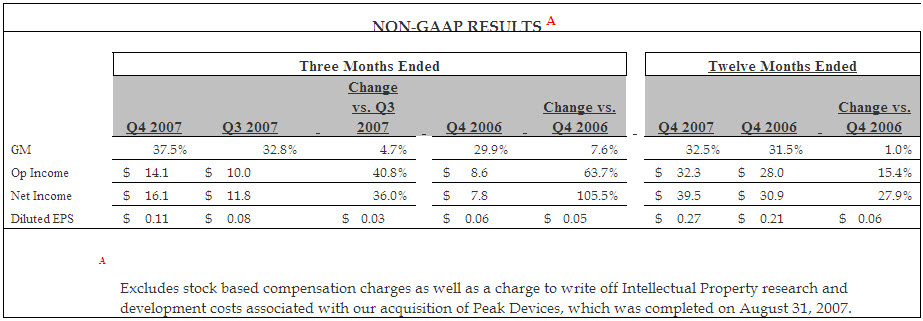 Excluding equity compensation expense of $2.3 million, net income for the fourth quarter of 2007 was $16.1 million, or $0.11 per diluted share. Excluding equity compensation expense and the charge for in-process research and development, on a comparable basis, non-GAAP net income grew by 36% sequentially and by 106% compared to the fourth quarter of 2006.