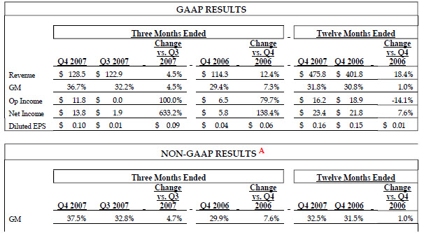 Revenue for the fourth quarter of 2007 was $128.5 million, up 12% from the fourth quarter of 2006 and up 5% sequentially. Revenues for the year ended December 31, 2007 was $475.8 million, an increase of 18% from revenues of $401.8 for the year ended December 31, 2006.